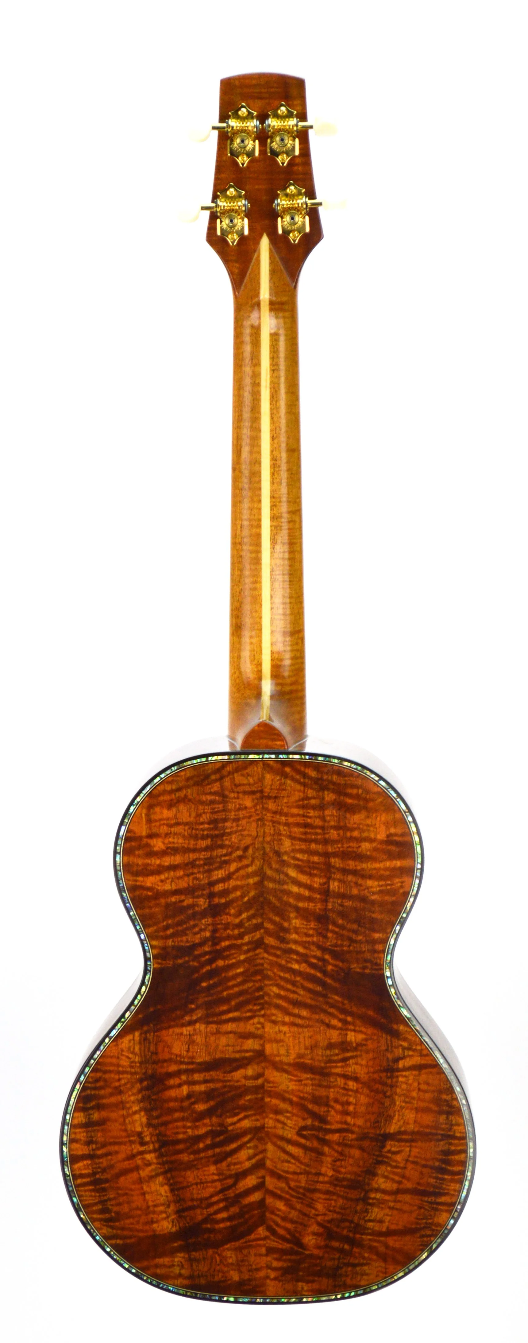 The model shown here is olive wood with a bearclaw sitka spruce top. Many option choices are available, including a resonator ukulele.