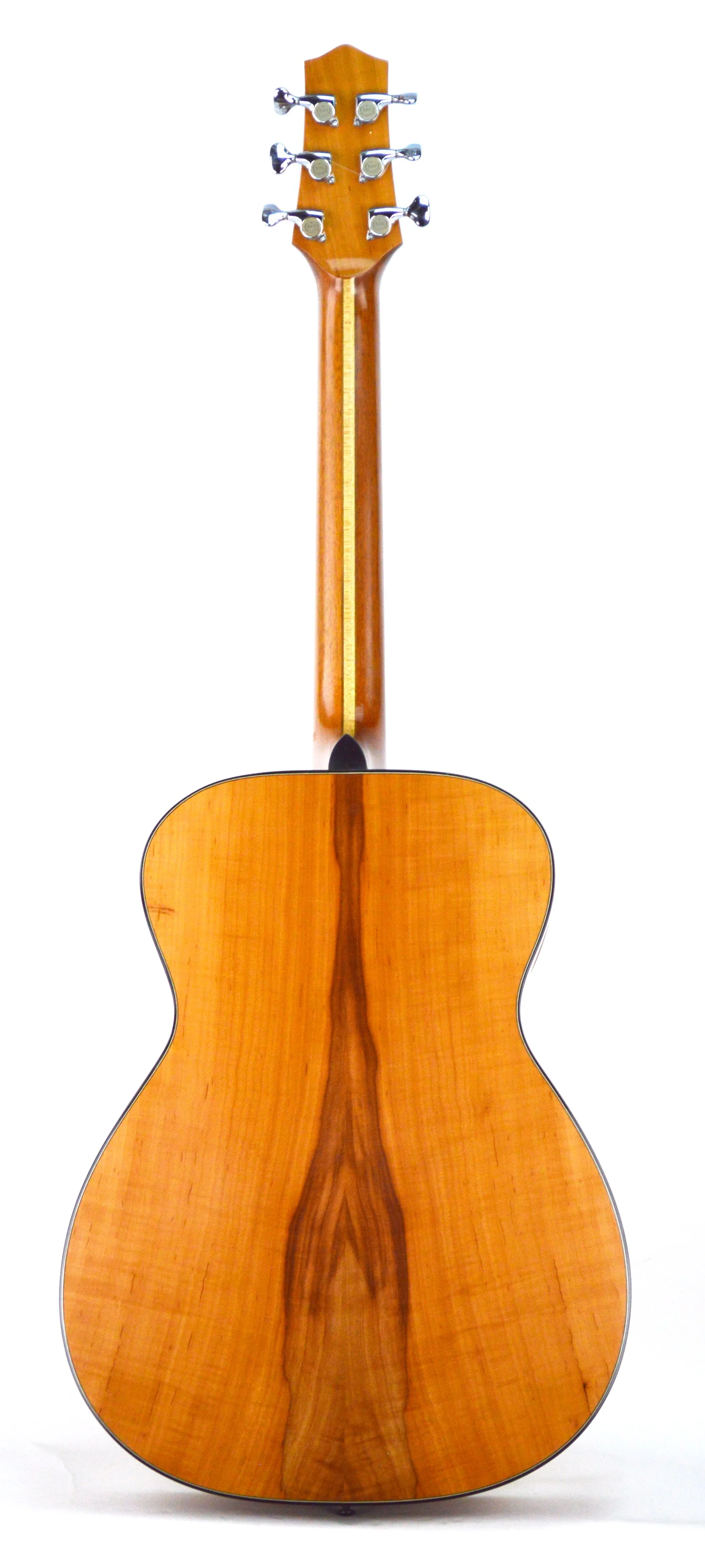 The Pearwood Nomad is an OM size guitar made with Swiss Pearwood back and sides a “Bearclaw” Sitka spruce soundboard, ebony binding, ebony bridge, ebony fingerboard and head cap, and a five piece laminated neck of Mahogany, maple and walnut. The scale length is 25.4” and the nut width is 1-3/4” with string spacing at the bridge of 2-1/4”. The tuning machines are Gotoh 510. The rosette is Mallee burl with my double helix design. The guitar also has an elliptical side port and mother of pearl inlays. It comes with a choice of hardshell case. $5300